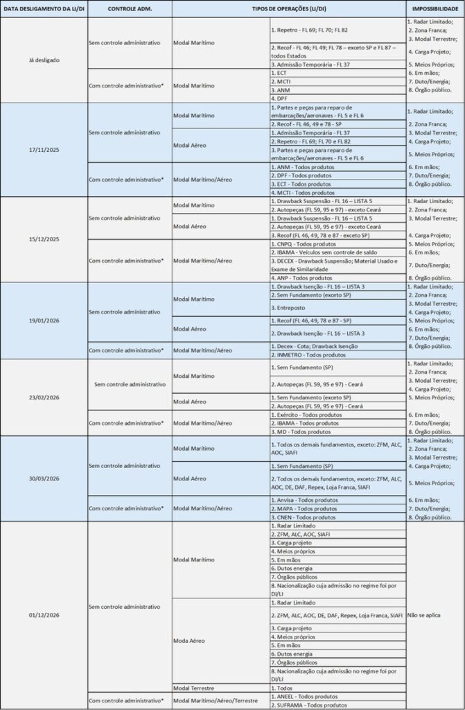 | A Secretaria de Comércio Exterior (Secex) e a Secretaria Especial da Receita Federal (RFB) apresentam o cronograma de desligamento do sistema Siscomex LI/DI, ampliando a obrigatoriedade de uso de LPCO e Duimp no Portal Único de Comércio Exterior, de acordo com o Novo Processo de Importação (NPI). Com relação a divulgação do cronograma anterior, ressaltamos que não houve mudança nas datas, somente incluíram no cronograma mais duas colunas com informações adicionais: “Controle Administrativo” e “Impossibilidade”. O cronograma de desligamento foi aprovado em reunião do Comitê Executivo do SISCOMEX e sua efetivação dependerá de validações feitas pelo setor privado no âmbito do Subcomitê de Cooperação do CONFAC, conforme Plano de Açãodivulgado em sua 10ª Reunião. O cronograma abaixo reflete as datas a partir das quais será obrigatório registrar LPCO e Duimp nas operações de importação, caso a validação pelo setor privado não tenha indicado problemas sistêmicos impeditivos, conforme definido no Plano de Ação. Desta forma, será vedado ao importador, a partir de então, a possibilidade de continuar realizando essas operações por meio do Siscomex LI/DI. Mais informações |